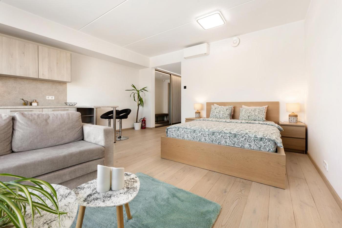 One-Bedroom Apartment. The air-conditioned apartment has 1 bedroom and 1 bathroom with a walk-in shower and a hairdryer. The fully equipped kitchenette features a stovetop, a refrigerator, kitchenware and an oven. The apartment features a flat-screen TV, a washing machine, a tea and coffee maker, a seating area as well as city views. The unit has 1 bed.